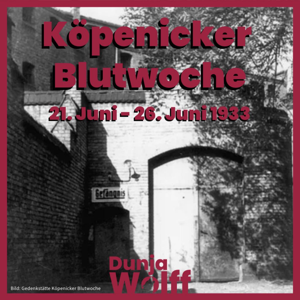 Die Köpenicker Blutwoche war einer der Höhepunkte des frühen Terrors der SA in Berlin. Im ganzen Land wurden zu dieser Zeit politisch Andersdenkende Opfer von Gewalt. In Köpenick wurden während der Blutwoche hunderte politische Gegner und Juden von der SA verschleppt und gefoltert. Mindestens 23 Menschen starben.